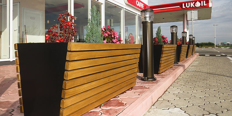 Žardinjere za cveće model ZRD 02 namenjene su za dekoraciju privatnih dvorišta, poslovnih objekata ili javnih površina. Konsktrukcija je izrađena od čeličnog lima, obložena drvenim letvicama. Metalni deo je dobro zaštićen plastifikacijom. Drvo kao i metal može da se farba u boju po želji.